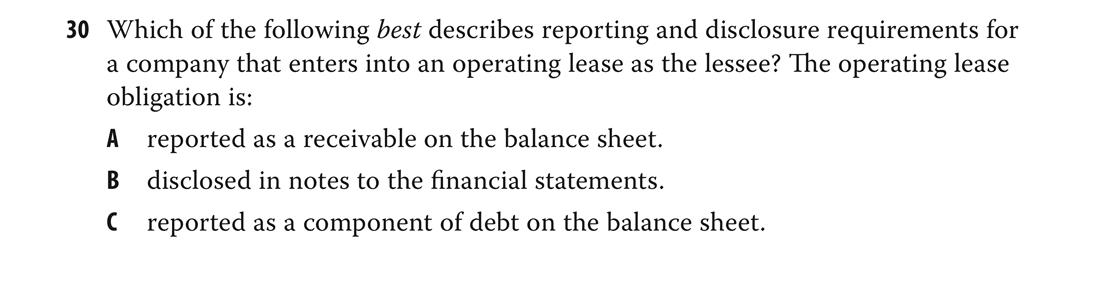 老师好,下图中的题目关于lease的。我的疑问在于,考纲貌似已经更新了,但是题目好像还是老考纲的。根据新考纲,在lessee的角度下,operating lease也是需要确认asset和liabililty的吧,只不过两者同步摊销;而费用的处理跟finance lease不同,不需要区分depreciation cost and interest expense,直接在I/S表中作为lease payement扣除。那为什么答案中还是说,operating lease不需要确认asset and liability, 所以不用作为debt的一部分report在B/S中呢? 另外,在做题的过程中,发现FSA中有很多关于信息披露的问题,哪些需要在表中披露,哪些需要在notes中披露,等等。但是这些点通常比较零散,上课的时候并没有作为重点整理过。原版书全部看一遍好像也不太现实,老师有没有可能帮我们整理一下然后分享给大家呢? 谢谢。