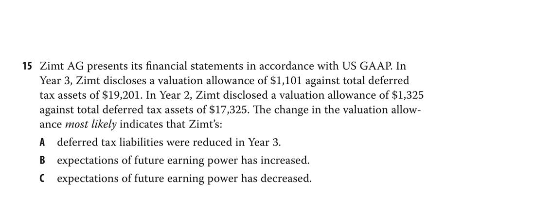 老师好, 请看图中第15题:我觉得看题干,Year 2比Year 1的valuation allowance是增加的啊,为什么答案是allowance是减少的呢?从哪里可以看出来是减少的呢?我看绝对值或者allowance/DTA的占比,都是year 2大于year 1啊?