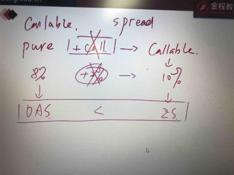 请问如何解释callable bond OAS小于Z spread 如图 老师说callable bond的收益率 就是10%是Z spread 可是ZS的定义是YTM减去benchmark啊? 第二 左边pure那里的8% 应该是不含权的yield 即option adjusted yield 但是为什么老师这里写他是OAS(OAS的定义是ZS减去call option)