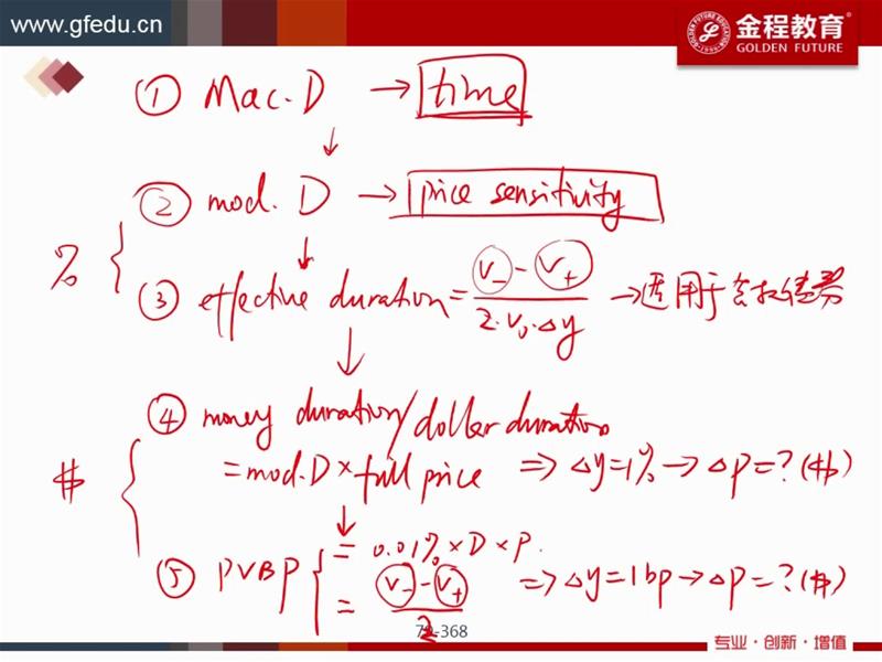 以下全为原版书: 1、P250,Exhibit 3,算这个Mac Dur可否用专业版计算器的bond功能算出Mod Dur,再乘以(1+r)?我算了,Mod Dur=6.183470?2、P254,example 8,最后一步为什么是13.466*1.0257,这不是年化么?为什么不乘以1.0514?在ModDur=MacDur/(1+r),这个公式中的r,假设是半年付息,就要是(年化r)/2对么?3、P274,公式16和P270公式13有什么联系区别?为什么公式13的PV带%,而公式16的PV没有%?4、P275,example14,这道题是否可用专业计算器算?我假设的是1-1-2000到12-31-2030,YLD=4.05,算出来的PRI=99.136145,和他的99.136214有点差别,请问我算错了?5、P294,第三题解答部分最后一句话中的“two points”指的是什么?6、P291,第14题,看了解释没明白,是因为P241图像,putable bond的曲线在普通bond上面的原因么?如果这道题换成callable bond,是否选B?