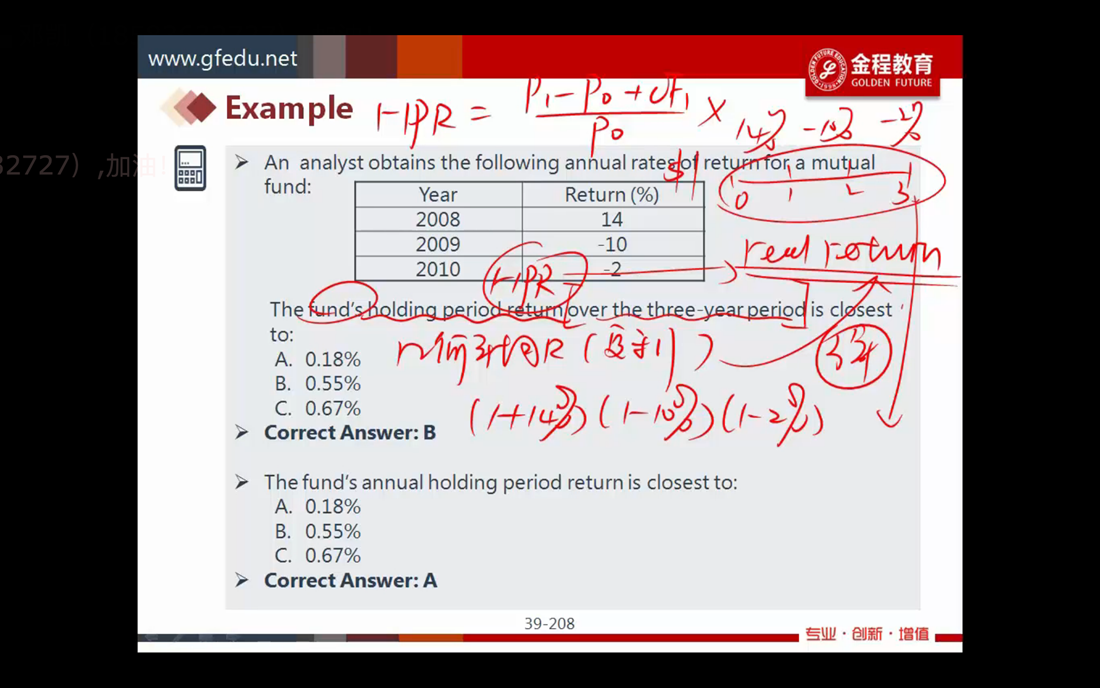 已回答老师您好, 关于课后练习题中的一道题如下: Year of investment Assets under at Return the beginning of each yr 1 $1,000 15% 2 $4,000 14% 3 $45,000 -4% Which return measure over the three-year period is negative? A) Geometric mean return B) Time-weighted rate of return C) Money-weighted rate of return 解析中是将TWRR和MWRR计算出来求解,请问除了用公式计算,是否还有其它简单方法或是规律求解?谢谢!