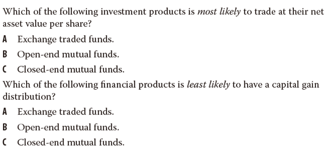 老师这三个选项我都知道什么意思,但这两个考点不太清楚。 1. 只有open-end共同基金可以交易每股净收益?这个不太理解 2. ETF由于投大盘指数,不能自由买卖某只股票所以没有资本利的分布,感觉是这个意思。对于open-end和close-end共同基金,基金经理是不是可以随意买卖某只股票获得资本利得分布。