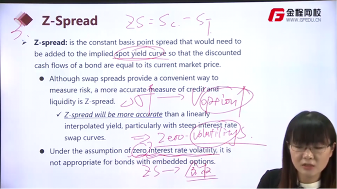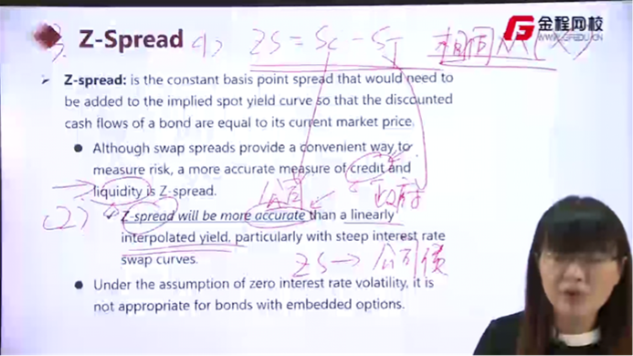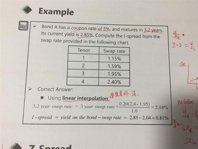 晕死了,Z-spread为啥比linearly interpolated yield更合理也没说,之前的例题光讲了线性差补法怎么算,跟这里没看出一点可比性,板书上写比线性差补法好也不用老师在翻译一遍了呀,就是不知道好在哪?