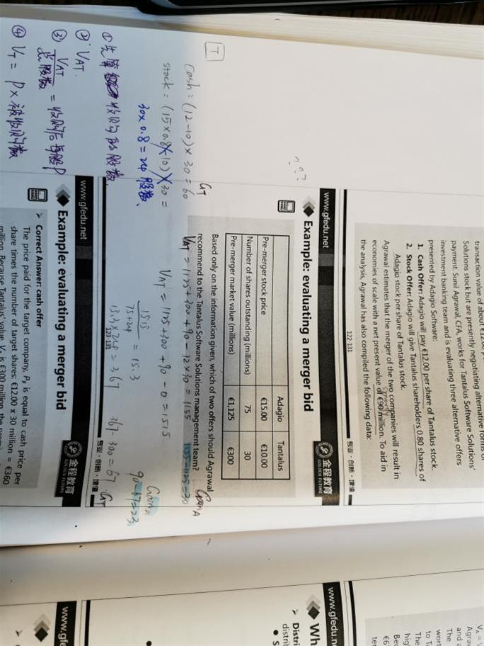 强化课M&A的例题, 1、为什么cash offer中,Gain(A)=1155-1125=30,而stock offer中,Gain(A)=1515-1125=390不对?