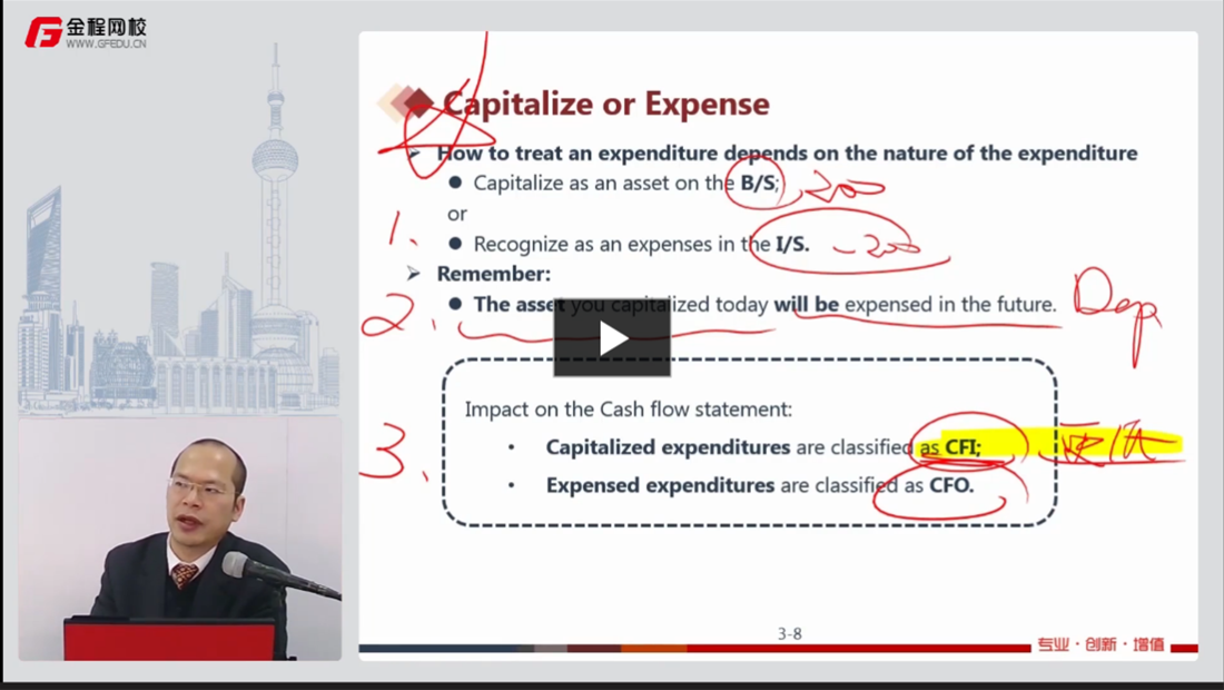 老师,图中【资本化费用计入CFI,CFI会更低】,针对这句话,我想问的是,【1】资本化一笔费用是代表outflow一笔费用吗?【2】我对资本化一笔费用的理解是“一笔费用被资本化,而被资本化的费用应该进入CFI中,所以前期应往CFI中inflow一笔费用,往后每年折旧时再从CFI中outflow。”这个理解是哪里出了问题?谢谢