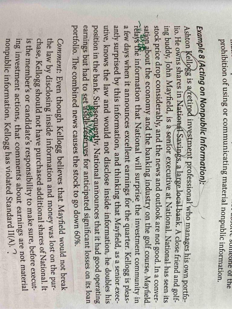 老师,这道题我有两个困惑~ 1. 虽然Mayfield说完相关National信息,可是题目中没描述Kellogg去purchase additional shares? 2. K怎么就违规了? thx!