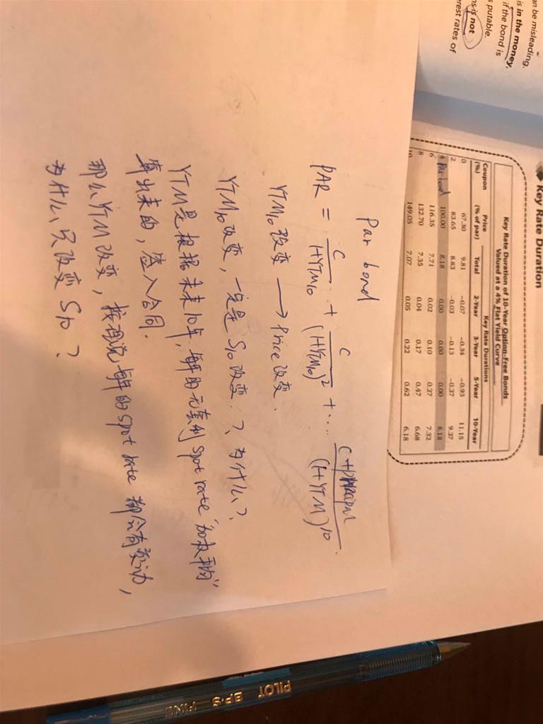 老师,麻烦问下,我还是不理解为什么part bond,其它时候的关键利率久期都是0?以十年期为例,我写在纸上,为什么YTM改变,只引起最后一年spot rate改变?十年期YTM应该是考虑到未来十年每年无套利下的市场即期利率,然后加权平均,定在合同里的。
