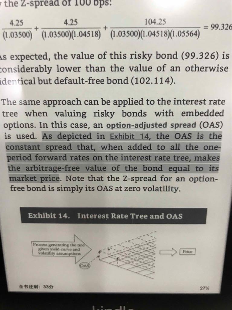 老师,我不太理解,对于嵌入式含权债券的估值,为什么分母用基准利率➕OAS折现? 既然OAS是剔除了option risk的风险补偿,那么嵌入式含权债券本来就是含有option risk 的,两者不是矛盾吗?