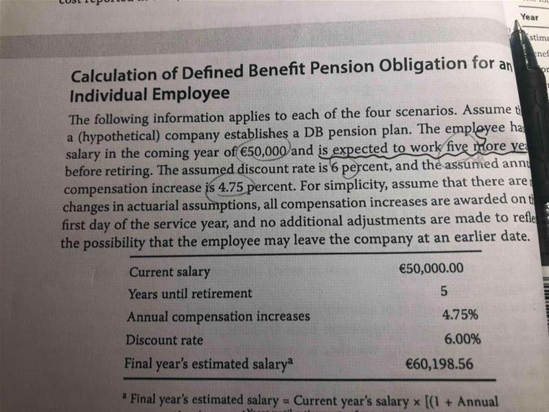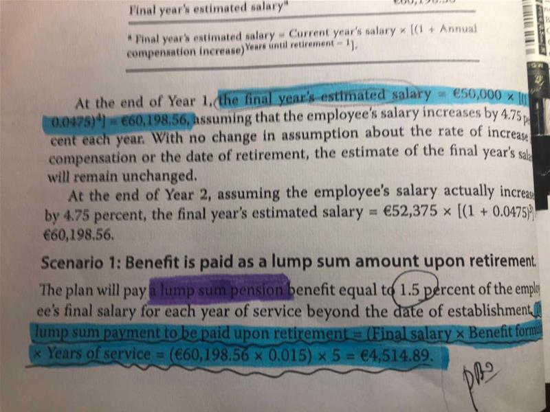 老师好,关于时间的问题我总是弄不清啊……原版书P74 例题2 题干说这个人expected to work five more years, 然后算final year's eatimated salary时候 是50,000(1+4.75%)的四次方而不是五次方?? 另,在scenario 1中 在算lump sum payment to be paid upon retirement时是乘以(60,198.56×0.015)×5年 这里又是5了??