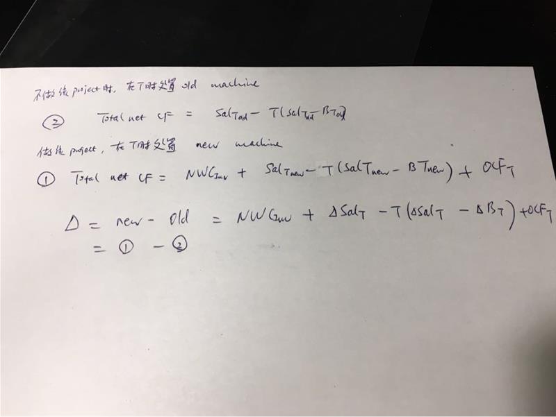 老师好, 我这样推 replacement capital project 里terminal stage 的公式推法对吗?这里的Delta Sal 是否就是market value of new machine at time T minus market value of old machine at time T? 谢谢。