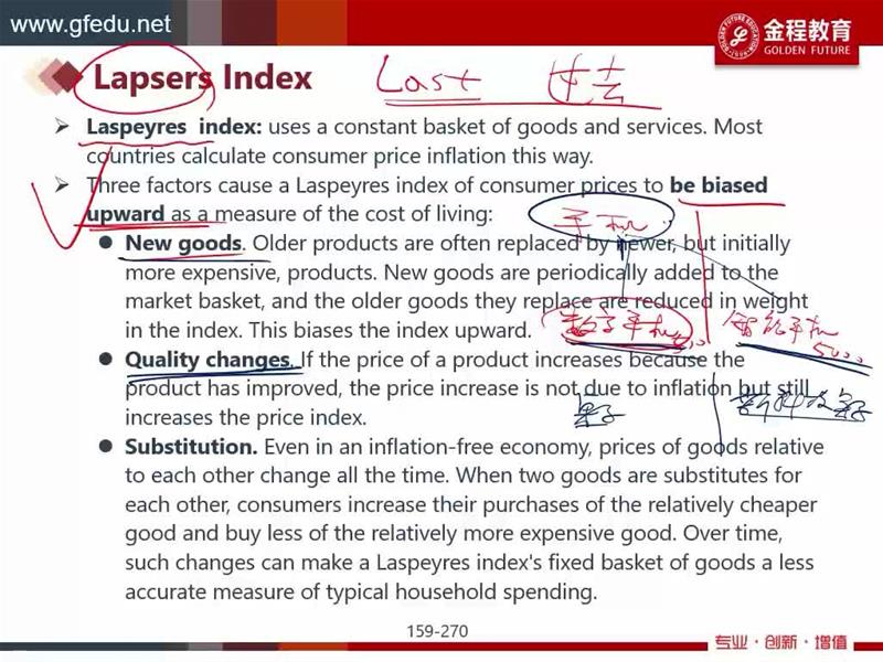 用lapsers index会高估CPI,老师从new goods, quality changes, subsitution三方面解释,没听懂。我只知道lapsers index是用过去的量。。。麻烦再解释一下,谢谢!