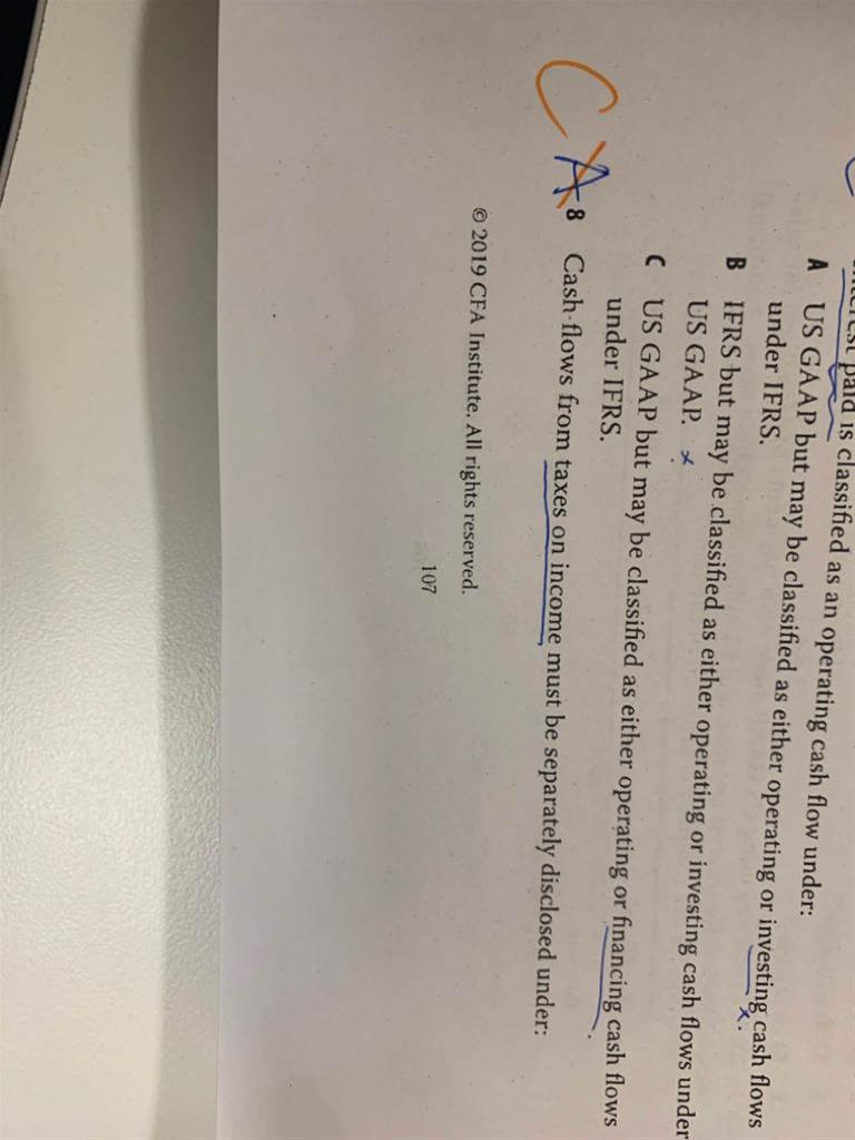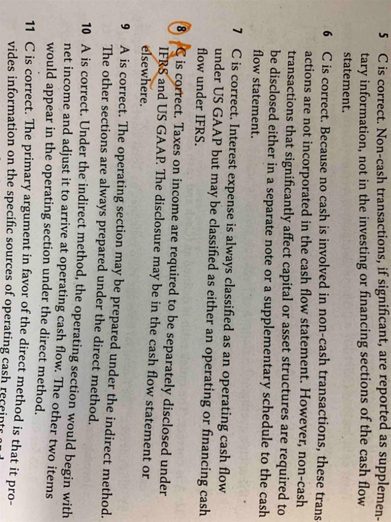 请问第八题,上课老师说GAAP下,所有的tax都属于CFO。IFRS下,tax分CFO,CFI和CFF。但是这本习题册给出的答案又是不同说法。请问以哪个为准?