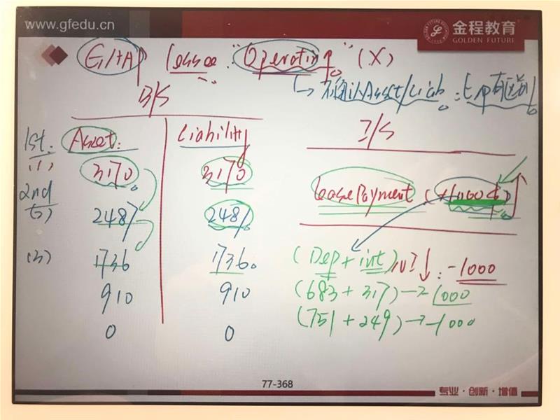 关于租赁的会计处理: 1、确认的负债科目中英文是什么?确认的资产科目是ROU使用权资产吗? 2、上课时老师提到老考纲下经营租赁的记账方法,假设每年支付租赁费用1000元,那么在利润表中记租赁费用1000元,与之对应的是不是在资产负债表里现金减少1000元,这样留存收益减少1000元,两边平衡? 3、如图所示,租赁支付的租赁费用1000元记在现金流量表中,以第一行为例,记账的时候是直接将这1000元分成317的CFO和683的CFF记对吧?但是在债券的记账中,实际支付的票面利息1000元全部记在CFO中? 4、如图所示,对于第一行数据,和债券一样,A列317元记在利润表租赁费用并使留存收益减少317元,资产负债表中现金减少1000元,租赁负债减少683元,等式两边平衡对吧?支付的1000元在现金流量表和资产负债表都记对吧?