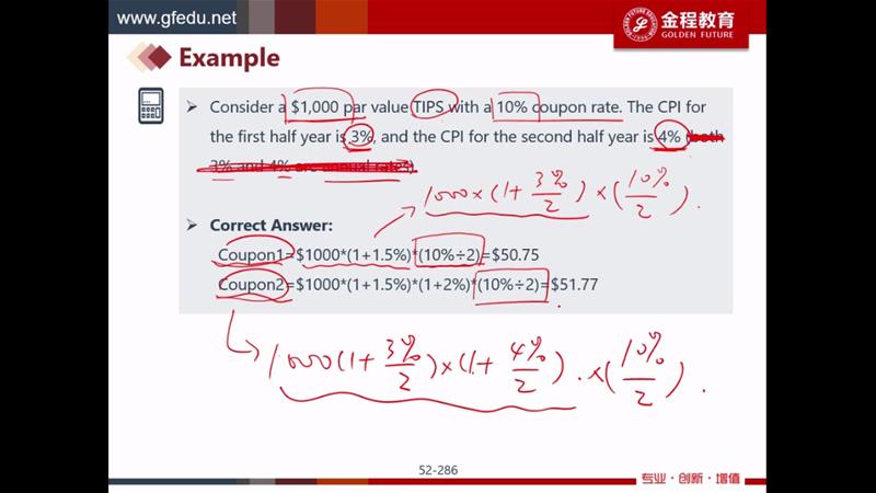 这个coupon2的计算,到第二年算通胀影响的终值*(1+4%\2)可以理解但是为啥 是*(1+3%/2)呢第一年通胀率3%应该全部算在第一年年末 coupon2=1000*(1+3%)(1+4%/2)*5% 不对吗???