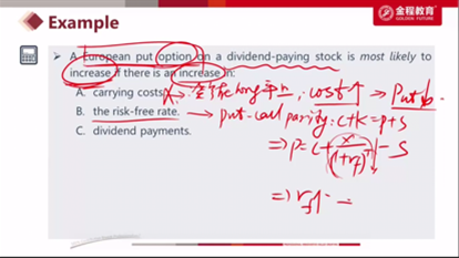 老师 这道题把S展开 无风险利率如果变高 相当于减去了一个更小的数 P应该变高才对,我的意思是无风险利率在平价公式里用了两次,是反方向的,为什么这里只看X对应的rf,不看S对应的rf