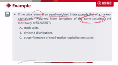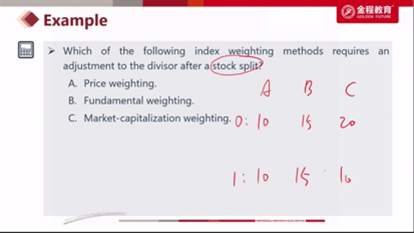 这道题说equal weight在股票拆分下基本没影响 我不理解为什么?股票拆分以后也会影响股票价格 从而影响收益率 所以也会影响指数啊 因为如果是三只股票 分母始终都是三吧