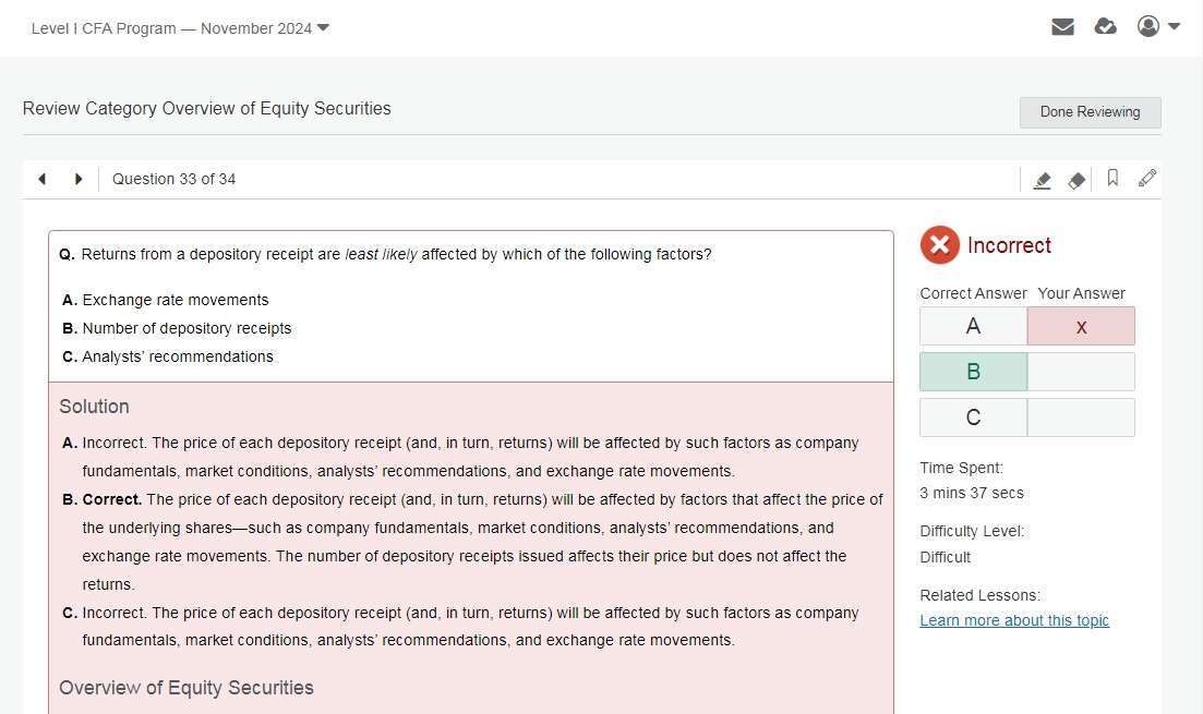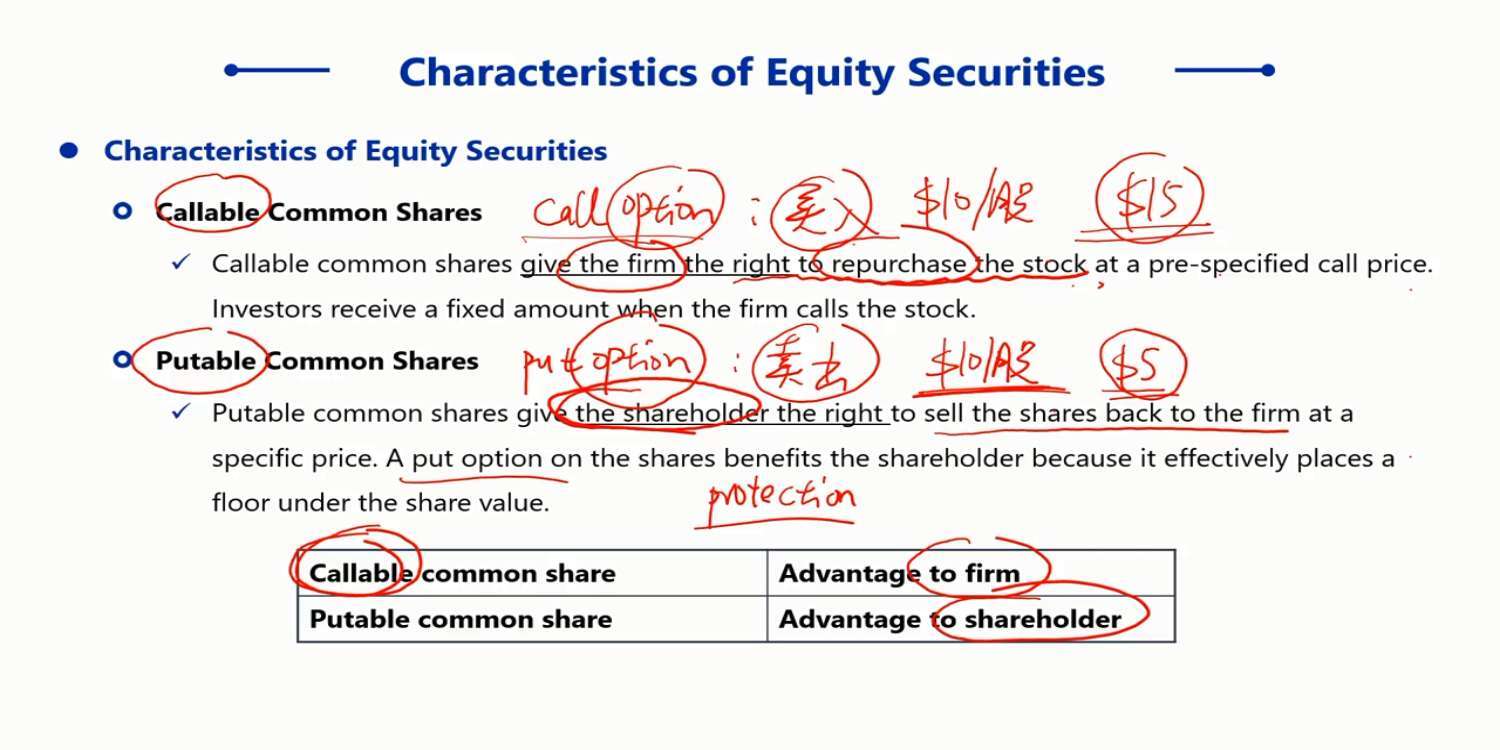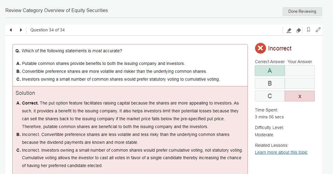 16分20秒所说,期权在谁手上,就对谁更有利。Callable common shares,这个call option在公司手上,所以它对公司更有利。Putable common shares,它在投资者手上,它对投资者更有利。我的提问是截图2中的官网习题-Question 34,根据视频所讲,那为什么还选A?putable不是只对投资者有利,对发行方是不利的吗?