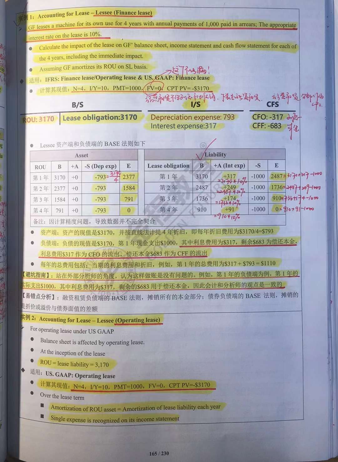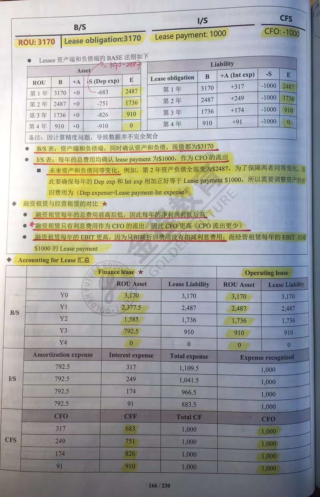 查看试题 已回答财报-百题-Question 96-根据视频讲解的,在finance lease当中,要分类确认,资产端确认depreciation expense,而负债端,要确认interest expense。但是没有rent expense。请结合截图1和截图2中的实例1-finance lease,和实例2-operating lease,分别说一下finance lease当中要确认的deprecaition expense是多少金额,interest expense是多少金额?这两个相加,是否应该等于operating lease下要确认的rent expense?另外,截图2中的下方表格,I/S那行,为什么total expense和expense recognized的数,不一致?比如一个是1.109.5,另一个是1,000?