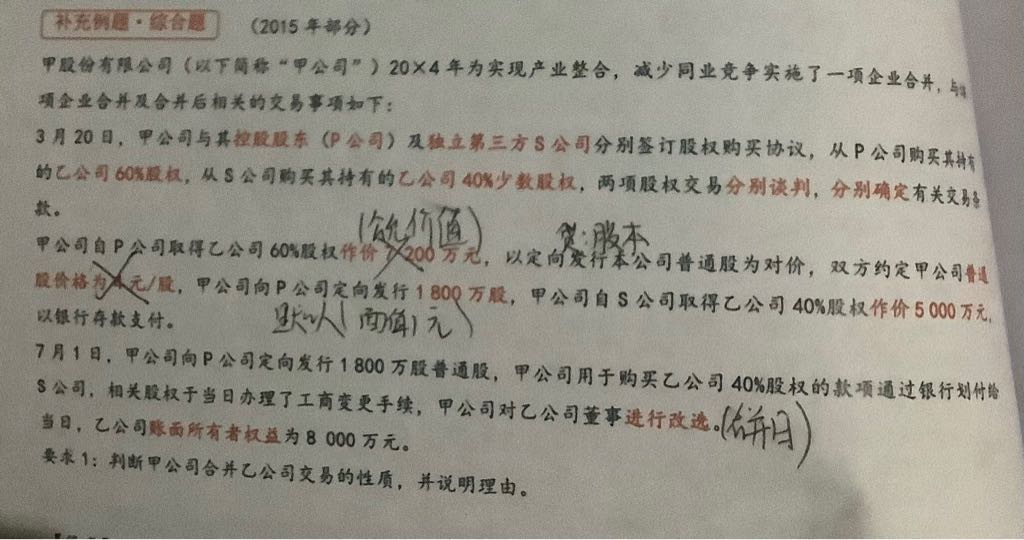 2×14年甲公司和其控股股东P公司以及无关联关系的第三方丙公司签订协议,分别从P公司处购买其持有乙公司60%的股权,从丙公司处购买少数股权40%;这两部份股权是同时购买的,都计入初始投资成本。