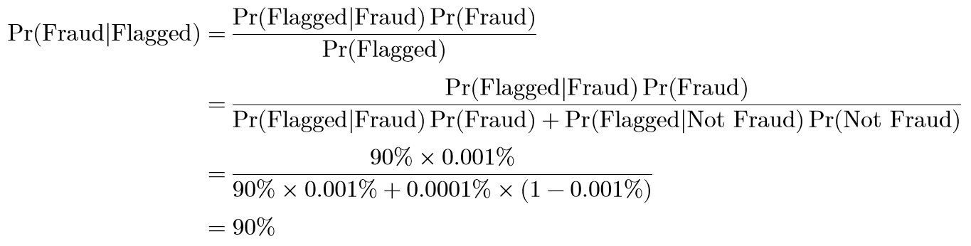 同学你好。见下图。0.0001%应乘上无欺诈的概率,这个概率不是100% - 90% = 10%,而是100% - 0.001% = 99.999%。
