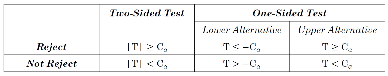 同学你好。这个要分情况来看。如果是双尾检验,那么不用管正负号,就看t统计量的绝对值是否大于关键值。如果是单尾检验,情况就复杂一些。比方说原假设中是μ <= 某个值,备择假设是μ > 某个值。此时,仅有当样本均值足够的高,我们才会倾向于认为原假设不对,而样本均值很低的时候并不能拒绝掉原假设。体现在检验统计量上,若样本均值足够的高,那么t-stat = (样本均值 - 原假设中的总体均值假想值)/样本均值标准误也会很大,如果是5%的显著性水平那么t-stat要大于1.645才会拒绝原假设。反过来,如果原假设中是μ >= 某个值,备择假设是μ < 某个值,那么仅有当样本均值以及相应的t统计量足够的小的时候才会拒绝原假设,如果是5%的显著性水平那么t-stat要小于-1.645才行。见下图总结(其中lower alternative指的是备择假设中符号为<,upper alternative则为>)。