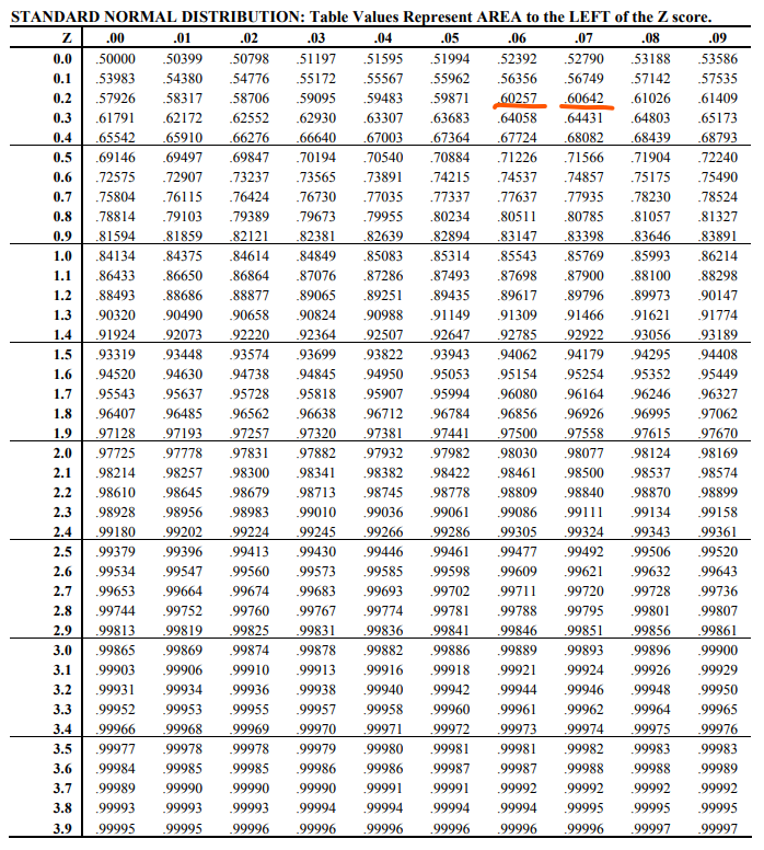 同学你好。首先通过线性插值法找到N(0.2627)。见下图z表,可见Pr(z <= 0.26) = 0.6026,Pr(z <= 0.27) = 0.6064。假设N(0.2627) = Pr(z <= 0.2627) = x,有(x - 0.6026)/(0.2627 - 0.26) = (0.6064 - 0.6026)/(0.27 - 0.26),解得x = 0.6036。根据标准正态分布沿0点对称的性质,有Pr(z <= -0.2627) = Pr(z >= 0.2627) = 1 - Pr(z <= 0.2627) = 1 - 0.6036 = 0.3964,此即N(-0.2627)。