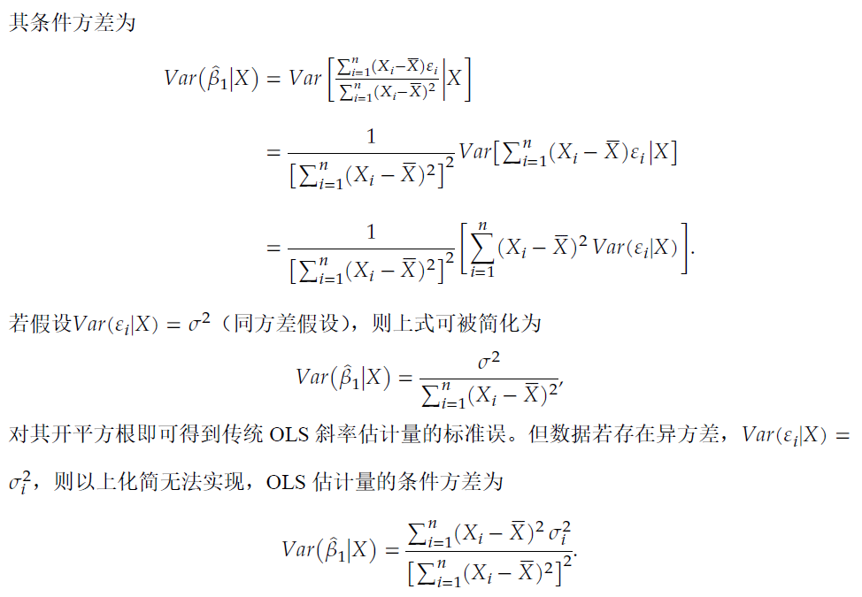 同学你好。此处的se为b的标准误。在计算b的标准误时会用到残差的方差(以斜率系数为例,见下图),且在古典线性回归模型的推导下假设了残差的方差恒定不变(这使得b的标准误算式变得较为简洁,且是OLS估计量成为BLUE的关键一环)。如果残差的方差不恒定,se的计算就不反映实际情况了,t统计量便会受到影响。这个内容直接记住结论即可。