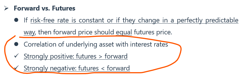 同学你好。这里涉及的是课件116页的结论,见下图。如果期货价格和利率呈反向关系,那么期货价格涨/跌,则利率倾向于下降/上升。如果期货价格涨,此时期货的多头是获利的,保证金账户收到更多的钱,但这些钱只能按照更低的利率水平去进行投资;如果期货价格跌,此时期货的多头是亏损的,需要按更高的利率借钱去补保证金账户的窟窿。然而,对于一个其它条件均相同的远期合约,上述问题是不存在的,因为远期合约是到期一次性结算。因此,价格与利率的反向关系对于期货多头而言是更不利的,对此期货多头需要获得补偿,补偿就体现在futures price偏低、低于forward price(说简单些就是让期货多头相比于远期多头少付点)。
