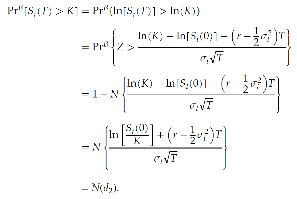 同学你好。BSM模型公式中用的是当前的股票现货价格,一般题目也只会给到你当前的股票现货价格。到期时的股票价格如果题目给的话会明确指出,而且到期股票价格是一个随机变量,我们当前在对期权进行定价的时候是不知道其具体取值的。对于d2和d1之间的大小关系,见下图图1。N(d2)是风险中性世界下St > K的概率,这是因为在风险中性世界下,dS = rSdt + σSdW,基于伊藤引理推导可得此时ln(ST) ~ N[ln(S0) + (r - 0.5σ^2)*T, σ^2*T]。因此,Pr(ST > K) = Pr[ln(ST) > ln(K)] = N(d2)。这个推导见下图图2。