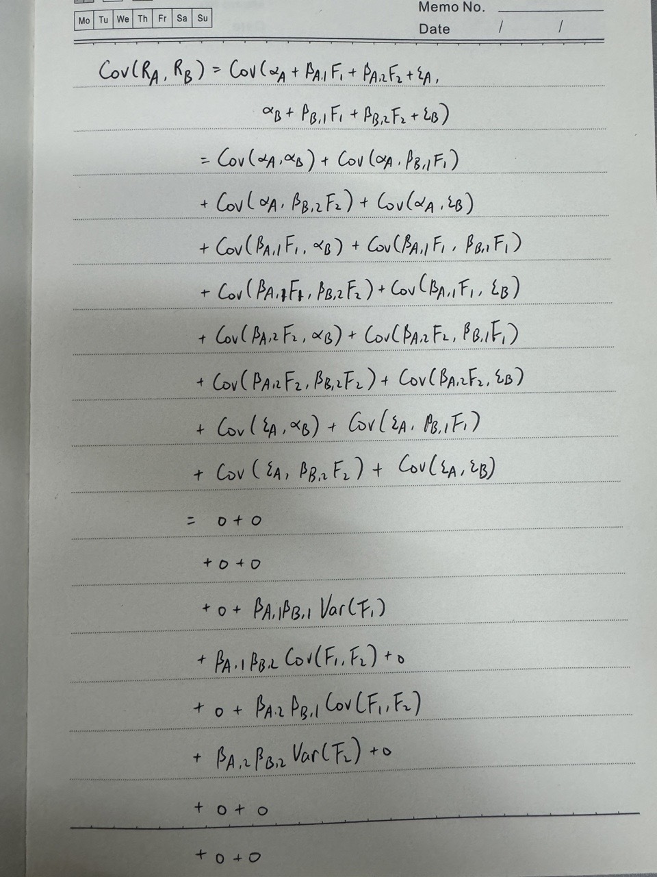 同学你好。见下图。首先常数项与任意变量之间都不存在联动性,故带有常数项的协方差都等于0;同时,题目假设e与F之间不存在联动性,同时不同的e之间也不存在联动性,所以涉及到e与F的Cov和e_A与e_B的Cov也都等于0。