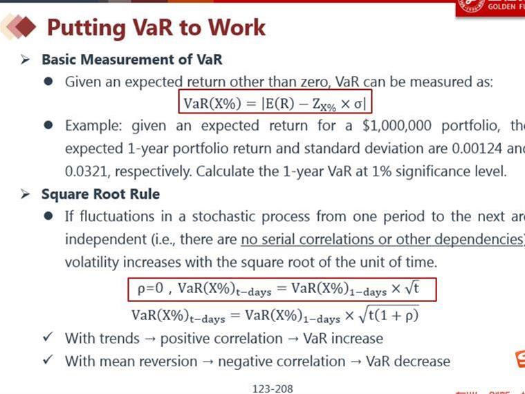 同学你好,我们在算多天的VaR值的时候,通常用的是平方根法则转换的,平方根法则的适用前提就是收益率独立同分布,无系列相关,无系列相关的表述就是题目中你画波浪线的地方,如果现在有了trend,就是相关性大于0的意思,那我们用平方根法则算出来的VaR就会偏小,真实的VaR就会偏大