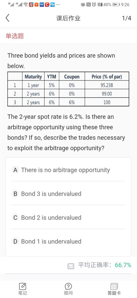 bond3是一个零息债券,如果它定价正确的话,一个零息债券的YTM应该等于对应期限的spot rate,但是这里YTM=6%,而spot rate=6.2%,不相等。所以债券2定价有问题。