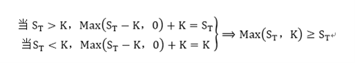 当ST大于K时,取ST。当K大于ST时,取K。所以,可以简单的写成Max(ST,K)。到期的收益Max(ST,K)是大于等于ST的。到期时的收益是这样的情况,那么它的期初价值的变化应该是同样的情况。所以,期初是一个看涨期权加上一个固定现金的投资,应该是大于等于S0。这个是根据期末的收益,推出期初的收益情况。