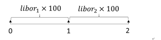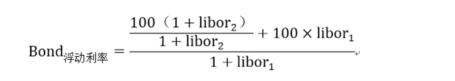 要算浮息债的价值,就是未来现金流求和,在这里不能把2时刻的现金流直接折现到0时刻,因为在0时刻投资者不知道投资者2时刻支付的现金流是多少,投资者只有在1时刻才能知道,所以,直接计算期初价值是不现实的,投资者在计算浮息债价值的时候,要用一个迂回的方式,先折到1时刻,在1时刻的时候投资者可以知道1-2时刻的利率,再加上1时刻的利息现金流,再折到0时刻,所以浮息债的价值计算,是用先折一期再折一期的方式计算出来的,一般用一般复利来进行计算。假如说投资者现在要计算浮息债0时刻的价值,浮息债的价值:图2