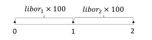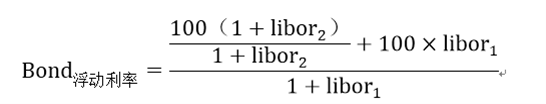 要算浮息债的价值,就是未来现金流求和,在这里不能把2时刻的现金流直接折现到0时刻,因为在0时刻投资者不知道投资者2时刻支付的现金流是多少,投资者只有在1时刻才能知道,所以,直接计算期初价值是不现实的,投资者在计算浮息债价值的时候,要用一个迂回的方式,先折到1时刻,在1时刻的时候投资者可以知道1-2时刻的利率,再加上1时刻的利息现金流,再折到0时刻,所以浮息债的价值计算,是用先折一期再折一期的方式计算出来的,一般用一般复利来进行计算。假如说投资者现在要计算浮息债0时刻的价值,浮息债的价值:图2