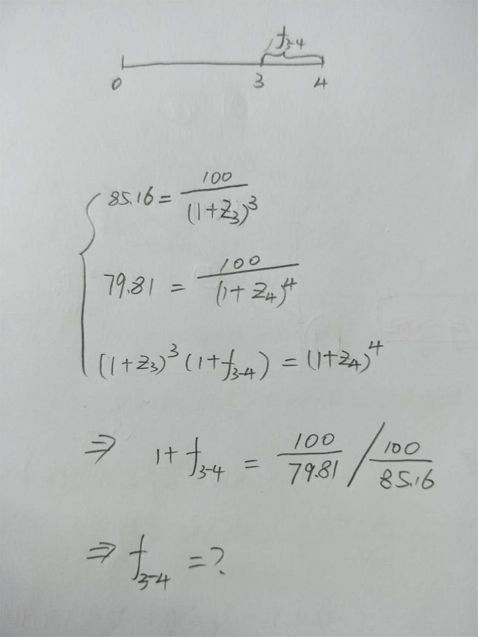 童鞋你好,这题考察点就是怎样由spot rate得出forward rate。只不过这里转了一个弯,spot rate不是直接给的(spot rate是一个零息债券的YTM)。过程如图