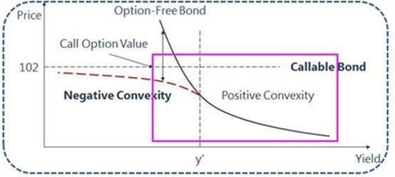 这题主要考察当收益率属于什么条件下callablebond的久期(option-adjustedduration of a callable bond)和一个普通债券的久期是比较接近的(similar non-callablebond)。这个问题可以转化为在什么条件下,callable bond不会提前赎回,最好能持有到期。因为如果callable bond不提前赎回,越能到期越好。因为如果到期,这个callable bond都没有赎回,那么它的久期就和一个普通债券的久期是similar,乃至相同。只有当收益率比较高的时候,发行人才不会提前赎回这个含权债。(一般当收益率比较低的时候,发行人体现赎回对其有利)。在图形来看的话,就是红框部分。即这个callable bond的价格在call price(这个图形中的102元的虚线)下面,发行人一般不会提前赎回这个债券。那么,这个含权债就有可能持有到期,那么这个callable bond的久期就越接近于一个普通债券的久期。