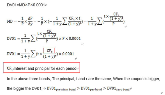 因为在其他条件不变的情况下,DV01的大小不仅和MD有关还和P有关,coupon变化不仅会影响MD还会影响P。所以要从DV01的公式入手