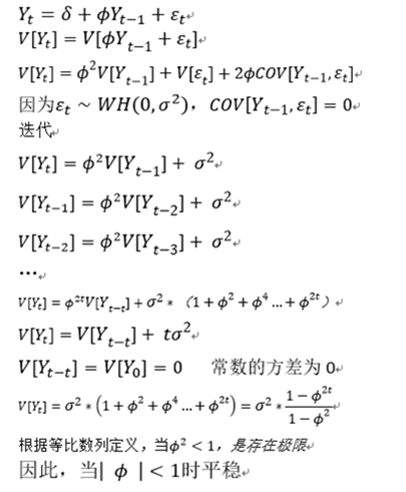 可见随着时间的推移, 随机扰动εt对Yt的影响持续存在,扰动不会收敛,因此方程的方差也随之不断变化。不符合序列宽平稳方差为常数的条件。序列的当前值无法通过历史值判断。