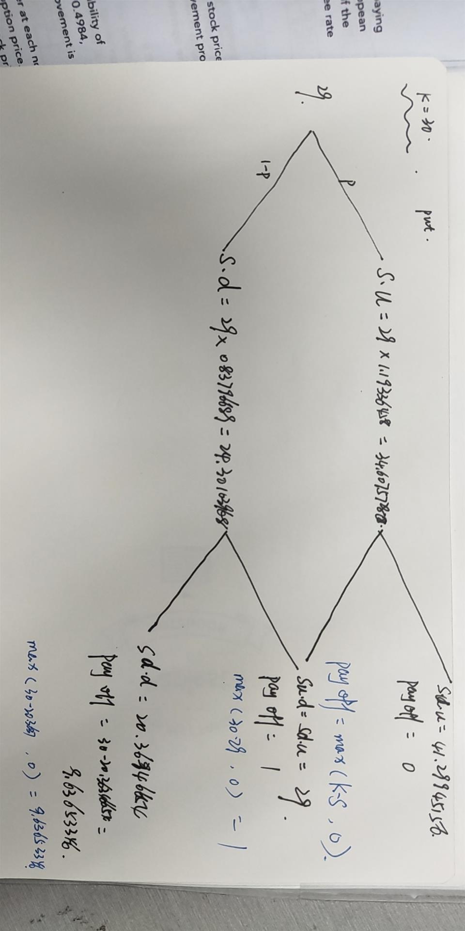 老师讲义上讲过 european call and american put, but have never mentioned european put. Anyways, the example from the text book got me a little confused. 可以麻烦老师画棵树 with the equation 告诉我为什么 fud=1, fdd=9.673 吗?另外看课本后面有 three or four-step tree, 这种会考吗?