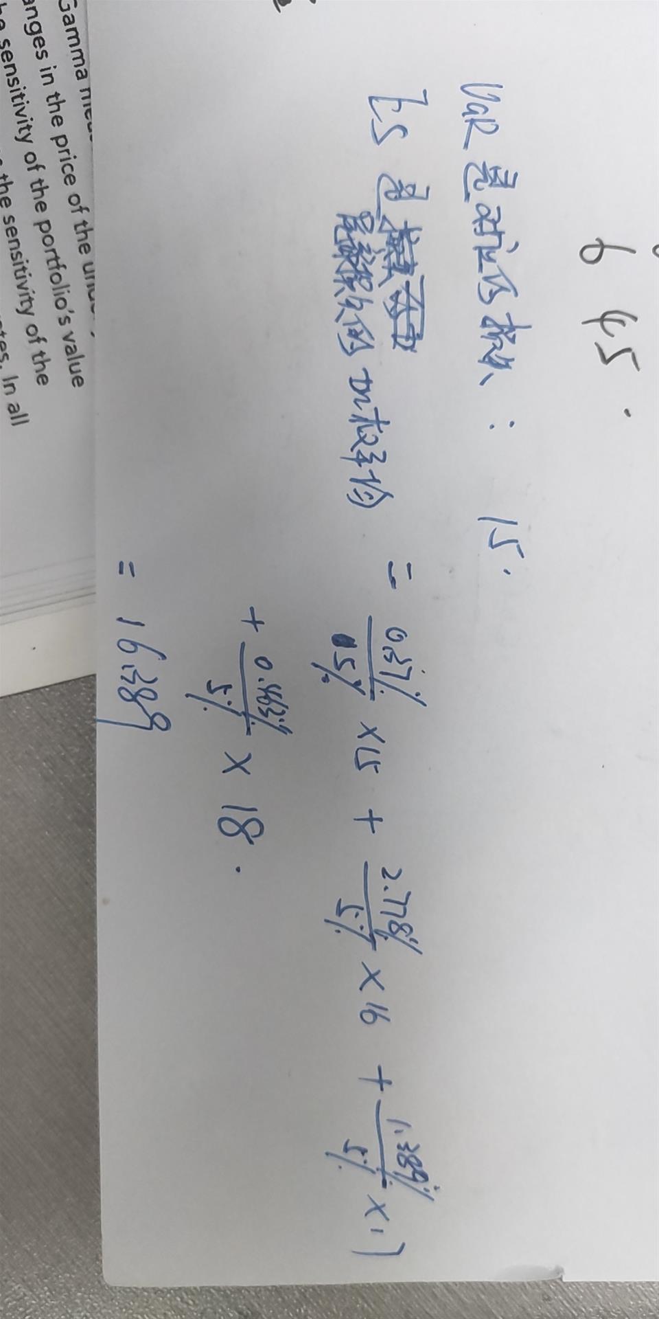 同学你好,先看题干,前面说的没有用,重点是:投掷三次骰子,得到的数字为损失(可能发生的损失为18/17/16/15/14等等),得到18的概率是1/216(概率的计算我就不写了)。。实际上就是找VAR与ES