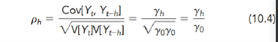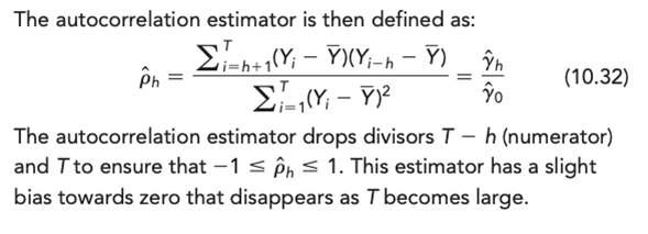 同学你好,上面那个10.4的截图是population的自相关系数,之前以为你问的是这个;你截图里的那个公式是样本的自相关系数;另外,你的反馈确实提出了一个很好的问题,我在翻阅原版书后,确实在计算分母的时候用T组数(对应的也就是除以T)会比T-h组(对应的也就是除以T-h)要好,虽然这两个在样本量比较大的时候很接近,但数组更多就能接近真实值,我跟授课老师也讨论过了,还是以原版书为准,即分母是除以T的。最后,再次感谢你的反馈和指正。