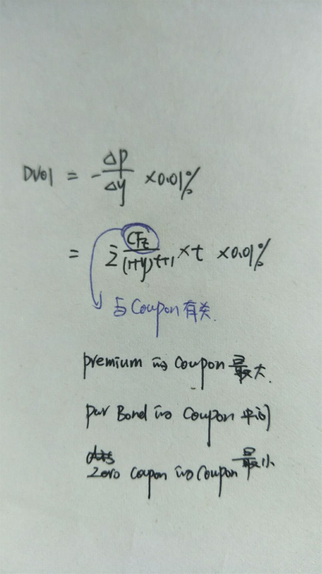 第二种方法因为coupon的变化不仅会影响债券价格还会影响久期,所以要通过DV01最本源的公式来理解,就如图2,通过CF去分析