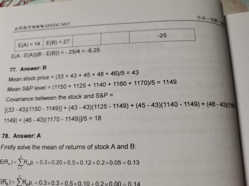 同学你好,76题中population算covariance是除以n,77题截取的是一周的股票价格,也就是样本的covariance,所以除以n-1。解析中也是除以n-1,请见附图。