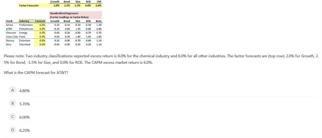 老师,我再追问另一个题,这个题目的答案我其实没看懂,不理解为什么用 1.1 β * 6% ERP?我也没看懂题目的问题,CAPM forecast和CAPM的公式不一样?不是很理解