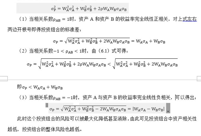 最小方差组合有可能,最小方差的这个组合有可能比单个资产的风险还要小。其实这个就是图中的最后一个公式:σP=WA*σA-WB*σB,是存在小于 σA的可能性的