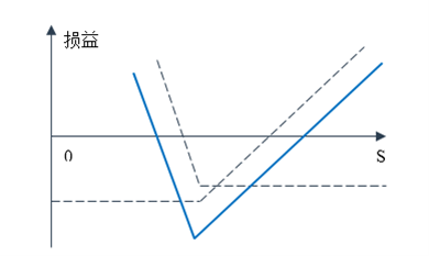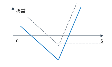 序列组合(strip)通过买入两个看跌期权,卖出一个具有相同执行价格的看涨期权构造。如图1。标的资产价格上涨的话,是涨一美元,赚一美元的。如果标的资产价格下降的话,是跌一美元,赚两美元的。赌的是波动,但是在标的资产价格下跌的时候赚的更多。是一个偏跌式的策略。