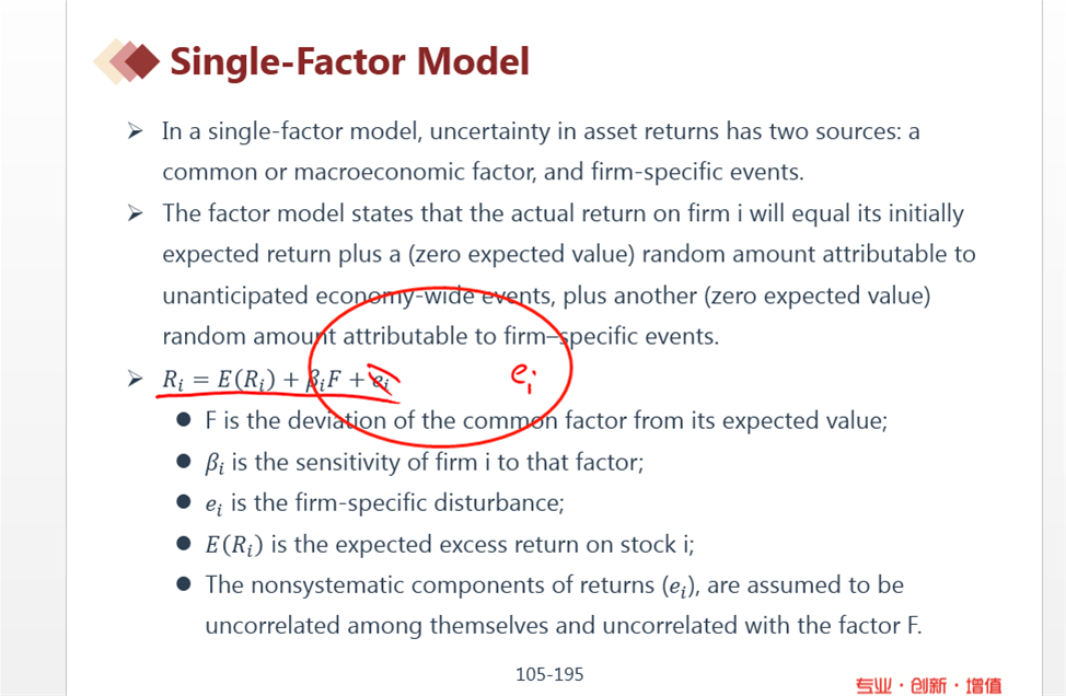APT是一个线性的回归公式,后面是有误差项ei的,误差项不相关(误差项与因子之间不相关、与期望收益率之间不相关、误差项与误差项之间不相关。关于相关性的概念在定量分析中还会深入学习的),并且它的均值为0,方差固定