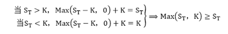 当ST大于K时,取ST。当K大于ST时,取K。所以,可以简单的写成Max(ST,K)。到期的收益Max(ST,K)是大于等于ST的。到期时的收益是这样的情况,那么它的期初价值的变化应该是同样的情况。所以,期初是一个看涨期权加上一个固定现金的投资,应该是大于等于S0。这个是根据期末的收益,推出期初的收益情况。