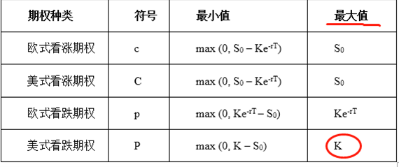 美式看跌期权随时都可以提前行权,所以在期初,也是可以行权的。所以在期初时,上限就可以直接判断出来,不可能超过第一天就行权赚取的K这么多的收益。所以它的上限,就是执行价格K,不需要折现,因为它随时都可以提前行权,